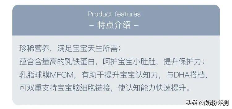 特色强化配方添加了天然乳脂、叶黄素、益生元组合和益生菌。天然乳脂和OPO结构脂的作用类似,在消化奶粉时可以减少钙皂的形成,从一定程度上降低便秘的几率,与OPO结构脂相比,天然乳脂是非化学转化,具有天然奶香风味,脂肪酸等营养物质也更为丰富;叶黄素需通过食物获取,能够帮助眼睛的视网膜抵御紫外线,有助于保护眼睛;益生元组合能促进体内有益菌的代谢和增殖,从而起到减少肠道中的有害菌的数量、维护肠道健康、降低便秘几率;益生菌可促进食物的消化和吸收,维持肠道环境平衡,益生菌数量及活力的充足对肠道健康非常重要。