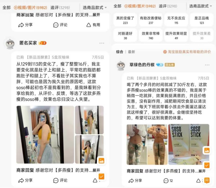 所以,多燕瘦的口碑两极分化非常严重。目前多燕瘦最畅销的产品便是酵素果冻,旗下还有益生菌果冻、排油丸、纤维素等产品。在多燕瘦淘宝旗舰店的评论区,靠多燕瘦产品瘦身十几斤到几十斤的人不少,这些人因为看到体重数字的下降,自然觉得它好。