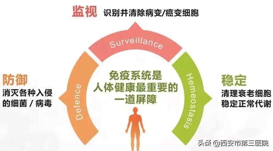 免疫系统是人体抵御病原体侵犯最重要的保卫系统,由免疫器官、免疫细胞及免疫分子组成,在人体中发挥着三大功能:免疫防御、免疫监视和自身稳定。